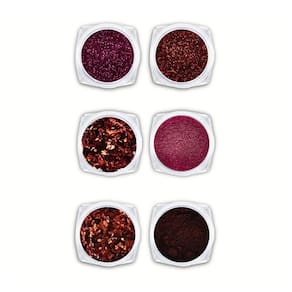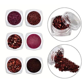 Características Principais: - 6 potinhos individuais; - Variados tons de vermelho; - Combinação de glitters finos, flocados e pó cromado; - Texturas variadas e efeitos brilhantes; - Tampa rosqueável que evita desperdício e facilita o armazenamento; - Ideal para quem busca adicionar mais glamour e criatividade aos seus designs.