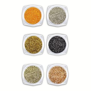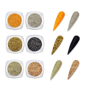 Contém: 6 - unidades de glitter fino nas cores preto, prata e tons de dourado. Glitters para aplicação em unhas são produtos de beleza projetados para adicionar brilho e glamour às inúmeras decorações que podemos fazer. Partículas de glitter que refletem a luz, proporcionando um efeito cintilante e brilhante quando aplicadas sobre esmaltes, misturados em géis, utilizados no encapsulamento, ou diretamente nas unhas. Indispensável para manicures, e também para as que amam unhas com muito brilho Características principais: - utilizados para criar decorações simples a encapsulamentos; - e doméstico; - pode ser Utilizado em qualquer técnica de alongamento e unhas de gel; - partículas finas e com muito brilho. Medidas: Embalagem do glitter: 1,5 x 2,8 x 0,6 centímetros a x l x p . Boas compras ; Marca: Arte Seducao Ean: 7908639603643