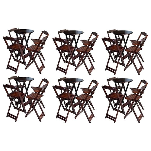 Kit 6 Jogos De Mesa Bistrô De Madeira Com 4 Cadeiras Dobravel Ideal Para Bar E Restaurante Imbuia é ideal para bares, restaurantes, estabelecimentos, áreas de lazer e tambem para sua casa. Feito em madeira maciça, tornando resistentes e duráveis. Seu design permite que seja encaixado em qualquer ambiente, trazendo um toque a mais para seu estabelecimento. Além de sua durabilidade, o que lhe trará conforto para servir seus clientes. Por ser dobrável torna-se mais fácil guardar, manusear e limpar o produto. Atenção: EVITE USAR PRODUTOS ABRASIVOS E QUíMICOS PARA LIMPEZA DO PRODUTO, aconselha-se o uso de pano umedecido para melhor conservação; mantenha o produto fora de chuva e sol constantes. OBS: MDF ULTRA