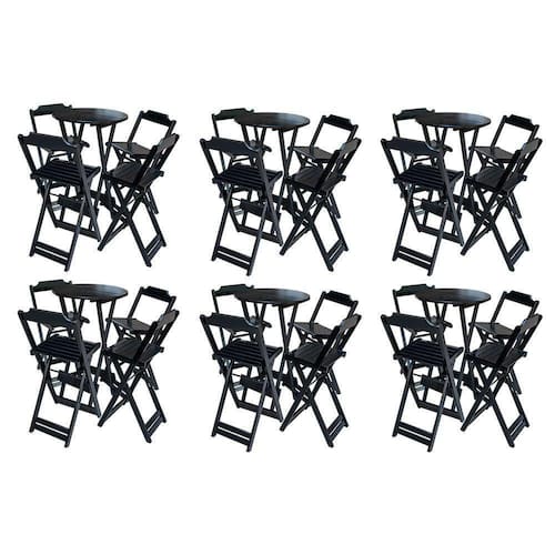 Kit 6 Jogos De Mesa Bistrô De Madeira Com 4 Cadeiras Dobravel Ideal Para Bar E Restaurante Preto é ideal para bares, restaurantes, estabelecimentos, áreas de lazer e tambem para sua casa. Feito em madeira maciça, tornando resistentes e duráveis. Seu design permite que seja encaixado em qualquer ambiente, trazendo um toque a mais para seu estabelecimento. Além de sua durabilidade, o que lhe trará conforto para servir seus clientes. Por ser dobrável torna-se mais fácil guardar, manusear e limpar o produto. Atenção: EVITE USAR PRODUTOS ABRASIVOS E QUíMICOS PARA LIMPEZA DO PRODUTO, aconselha-se o uso de pano umedecido para melhor conservação; mantenha o produto fora de chuva e sol constantes. OBS: MDF ULTRA MESA Cor: Preto Modelo: Bistrô Dobravel Dimensões: Altura 99cm | Largura 55cm | Profundidade 55cm CADEIRA Cor: Preto Modelo: Bistrô Dobravel Dimensões: Altura 100cm | Largura 38cm | Profundidade 37cmKit 6 Jogos de Mesa Bistrà de Madeira com 4 Cadeiras Dobravel Ideal para Bar e Restaurante Preto Marca: Preguiçosa