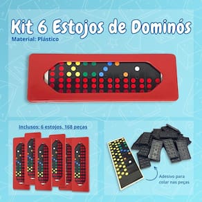 O que você vai receber em sua casa conteúdo da embalagem - um kit de 6 jogos de dominó com estojo em plástico.