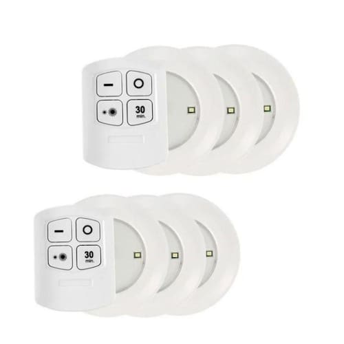 Kit 6 Luminaria Lampada Led Spot Sem Fio Controle Remoto Pilha Adesivo O controle remoto IR permite que você ajuste o brilho em 2 níveis, e também, permite o controle de tempo para desligar a luz em 30 minutos sem fio. Você também pode ligar / desligar a luz do disco, tocando no interruptor na lente das luzes. Cada luminária possui 5 leds. Instalação Fácil: Use o adesivo de dupla face para fixar em qualquer lugar que você queira iluminar. Alimentado por pilhas AAA (não incluídas) para instalação sem fio. Ideal para cozinha, armário, Rack, mesinha de cabeceira, balcão, prateleira, garagem, porão , Como luz de emergência ou locais escuros semelhantes, onde você pode precisar de alguma iluminação forte por alguns minutos de vez em quando.