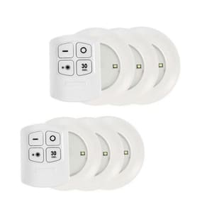 Kit 6 Luminaria Lampada Led Spot Sem Fio Controle Remoto Parede Teto Armários O controle remoto IR permite que você ajuste o brilho em 2 níveis, e também, permite o controle de tempo para desligar a luz em 30 minutos sem fio.Você também pode ligar / desligar a luz do disco, tocando no interruptor na lente das luzes. Cada luminária possui 5 leds.Instalação Fácil: Use o adesivo de dupla face para fixar em qualquer lugar que você queira iluminar.Alimentado por pilhas AAA não incluídas para instalação sem fio.Ideal para cozinha, armário, Rack, mesinha de cabeceira, balcão, prateleira, garagem, porão , Como luz de emergência ou locais escuros semelhantes, onde você pode precisar de alguma iluminação forte por alguns minutos de vez em quando. 5 leds em cada luminária Cor da Luz: Branco Frio Potência: 5w por Luminária Tipo de bateria: 3 pilhas AAA Tipo de bateria de controle remoto: 2 pilhas AAA Tipos de acendimento: toque ou controle remoto Dimensão lâmpada: 9x7x2.1cm Dimensão controle: 8x5.9x1.5cm Conteúdo da embalagem 6 Luminárias Com 5 Leds Cada 2 Controles Remotos Imagens meramente ilustrativas