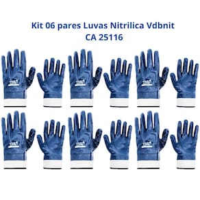 Kit 06 pares Luvas Nitrílica VDBNIT Punho de Lona CA 25116 Proteção Contra Produtos Químicos e Mecânicos A luva nitrílica VDBNIT punho de lona da Volk foi desenvolvida para garantir proteção e durabilidade em atividades que exigem resistência a produtos químicos e mecânicos. Com revestimento em borracha nitrílica e punho de lona, ela oferece conforto, segurança e excelente desempenho.