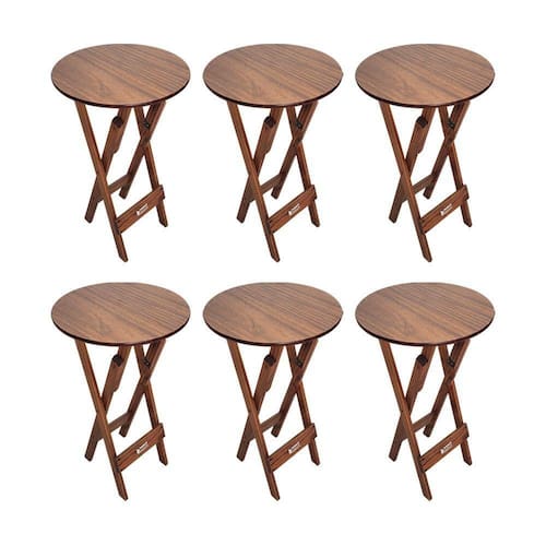 Kit 6 Mesas Bistrôs Dobráveis De Madeira Redonda Imbuia - TarimatãA mesa redonda e banqueta bistrô é ideal para bares, restaurantes, estabelecimentos, áreas de lazer e também para sua casa. Em madeira maciça, tornando resistente e durável. Seu design permite ser encaixado em qualquer ambiente, trazendo um toque a mais para seu estabelecimento. Além de sua durabilidade, o que lhe trará conforto para servir seus clientes. Por ser dobrável torna-se mais fácil guardar, manusear e limpar o produto.CARACTERÍSTICASTipo: Mesa RedondaModelo: Bistrô DobrávelCor: ImbuiaEstrutura: Madeira MaciçaDIMENSÕES DA MESAAltura: 98cmAltura fechado: 115cmDiâmetro: 58cmATENÇÃOIMAGENS MERAMENTE ILUSTRATIVAS REALIZADO EDIÇÃO, PODENDO HAVER UMA PEQUENA VARIAÇÃO DE COR DEPENDENDO DE CADA TELA OU MONITOR.Kit 6 Mesas BistrÃs DobrÃveis de Madeira Redonda Imbuia