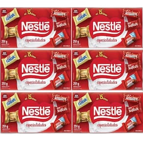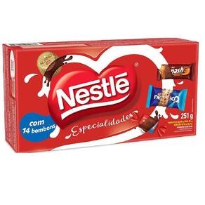 Kit 6 nestle bombons 251gr espec. Cx Os bombons nestlé especialidades são uma caixa de bombons que contém os maiores sucessos da nestlé. A caixa inclui bombons de chocolate branco, chocolate ao leite, recheados com amendoim e morango, entre outros. A caixa de bombons nestlé especialidades contém: -derivados de leite, soja, ovo, cevada e trigo -lactose -glúten -aromatizante sintético A caixa de bombons nestlé especialidades contém: -prestígio, alpino, suflair, classic ao leite, galak, lollo, charge, sensação, chokito, smash, negresco. Contém:251g Cod. Ean 7891000325131 Formato de venda: 01 kit Contém:6 unidade nestle bombons 251gr especialidades Marca: Não Informado