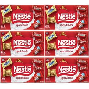 Kit 6 nestle bombons 251gr espec. Cx Os bombons nestlé especialidades são uma caixa de bombons que contém os maiores sucessos da nestlé. A caixa inclui bombons de chocolate branco, chocolate ao leite, recheados com amendoim e morango, entre outros. A caixa de bombons nestlé especialidades contém: -derivados de leite, soja, ovo, cevada e trigo -lactose -glúten -aromatizante sintético A caixa de bombons nestlé especialidades contém: -prestígio, alpino, suflair, classic ao leite, galak, lollo, charge, sensação, chokito, smash, negresco. Contém:251g Cod. Ean 7891000325131 Formato de venda: 01 kit Contém:6 unidade nestle bombons 251gr especialidades Marca: Não Informado