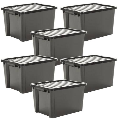 Prático conjunto de recipientes LifeBox pretos multiuso de 95 litros com tampas hermeticamente fechadas de alta resistência que permitem empilhá-los para economizar espaço. Todos os nossos produtos têm garantia de 6 meses.
