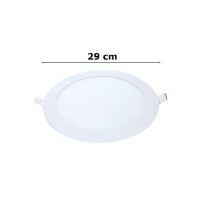 Informações técnicas: LED integrado Potência: 24W Temperatura: 6500K Emissão de luz branca Diâmetro: 29 cm Forma: Redondo Lúmens: 1680 IRC: =70 Ângulo de abertura: 120 Material: Corpo em alumínio, difusor em vidro, corpo do driver em plástico Eficiência luminosa: 70lm/W Painel de embutir Vida útil: 25 mil horas L70 Pode ser ligado diretamente na rede elétrica em 127V ou 220V Espessura do forro deve ser pelo menos 1cm Não permite dimerização
