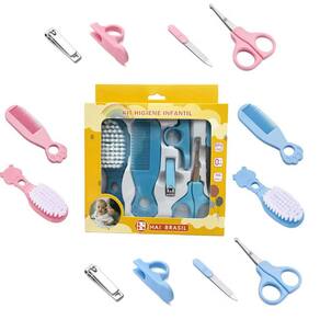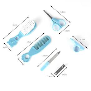 1 - cortador de unha; 1 - tesoura com pontinha arredondada; 1 - escova de cabelo com cerdas macias; 1 - pente; 1 - lixa de unha e 1 - adaptador para cortador de unhas. Kit 6 pçs higiene cuidados saúde bebê recém nascido infantil