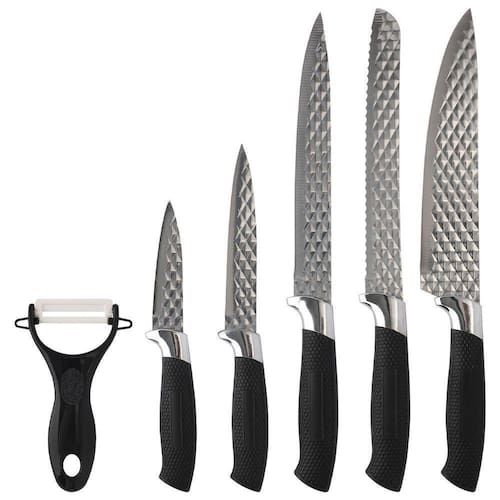 - 01-Faca do Cheff: 32cm x 4cm01-Faca de Pão: 32,5cm x 2,6cm01-Faca de Cozinha: 32,5cm x 3cm01-Faca de Cozinha 23,5cm x 2,5cm01-Faca de Legumes: 19,8cm x 2,5cm01-Descascador: 13cm x 8cm