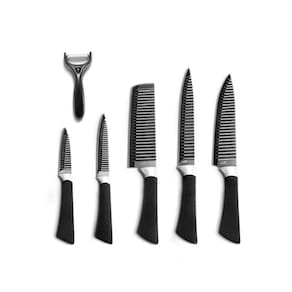 - dimensões da peça: - descascador: 14,5 x 6,2 x 2cm - faca legumes: 20,5 x 3 x 1,6cm - faca de cozinha: 24 x 3 x 1,6cm - faca de cozinha: 33,5 x 3,6 x 2,1cm - faca de pão: 33,5 x 3,6 x 2cm - faca de carne: 33,5 x 4,4 x 2,1cm - dimensões da embalagem: 36 x 21,5 x 3cm