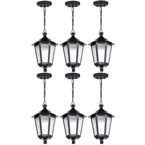 Garantia: 90 dias / Peso total: 3,960kg / Cor predominante: preto / Ref: 7794463043034; Dimensões totais dos pendentes: 18cm (C) x 18cm (L) x 58cm (A); Conteúdo: 6 pendentes de teto; Soquete: E27; Potência máxima: 20w; Material: plástico, alumínio; Modelo: Grega.
