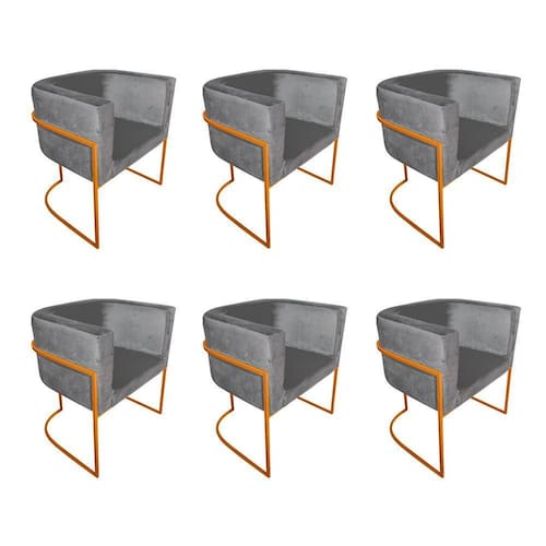 AS IMAGENS SÃO MERAMENTE ILUSTRATIVAS E PODEM SOFRER VARIAÇÕES DE COR E PEQUENOS DETALHES DE ACORDO COM O SEU MONITOR, ILUMINAÇÃO DO AMBIENTE E ATÉ MESMO A SUA PERCEPÇÃO VISUAL.Kit 6 Poltronas Decorativa Sala De Estar Base De Ferro Cobre Veludo Cinza