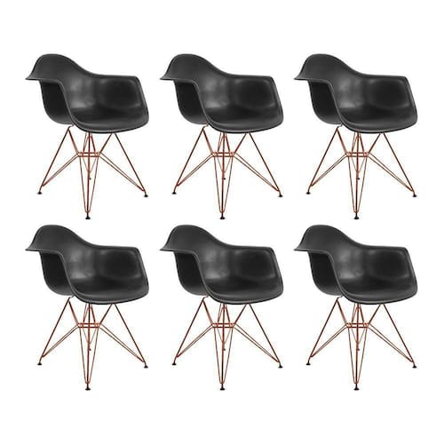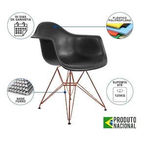 Kit 6 Poltronas Eiffel Eames Preta Com Braço Daw Em Ferro CobreA Poltrona Daw traz ousadia que combina com ambientes de estilo moderno, podendo ser usada em escritórios, cafés, salas de estar ou jantar e outros ambientes. Possuindo braços que a torna uma ótima escolha para quem está em busca de conforto e um design único.Tipo: PoltronaModelo: DawCor do Assento: PretoCor da Base: CobreCARACTERÍSTICASAssento: PolipropilenoBase: FerroSuporta até: 120kgGarantia: 90 DiasDIMENSÕES DO PRODUTOAltura: 80cmAssento até o chão: 40cmBraço do assento até o chão: 65cmLargura: 38cmComprimento: 38cmRECOMENDAÇÕESLimpeza: Utilize um pano macio levemente úmido.Necessita montagem.ATENÇÃOAS IMAGENS SÃO MERAMENTE ILUSTRATIVAS E PODEM SOFRER VARIAÇÕES DE COR E PEQUENOS DETALHES DE ACORDO COM O SEU MONITOR, ILUMINAÇÃO DO AMBIENTE E ATÉ MESMO A SUA PERCEPÇÃO VISUAL.Kit 6 Poltronas Eiffel Eames Preta com BraÃo Daw em Ferro Cobre