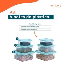 O kit contém: 2 potes de plástico quadrados 250ml 2 potes de plástico quadrados 500ml 2 potes de plástico quadrados 1L"