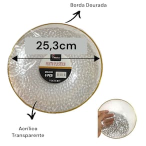 Contém: 6 unidades Pratos Refeição Redondo Transparente Acrílico Borda Dourada 25,3cm
