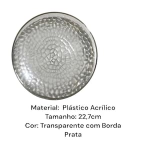 Design Elegante: A borda Prata combina beleza e requinte, tornando cada refeição uma experiência especial. Material Durável: Feitos em acrílico de alta qualidade, os pratos são resistentes, leves e perfeitos para uso interno e externo. Versatilidade: Ideal para servir saladas, entradas, pratos principais ou sobremesas em festas, celebrações e reuniões familiares. Fácil de Limpar: Podem ser lavados à mão, facilitando a limpeza após o uso. Dimensões: Cada prato tem 22,7 cm de diâmetro, perfeito para servir porções generosas.