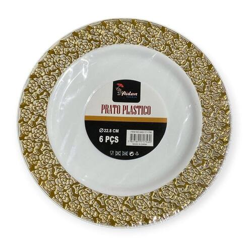 Kit 6 Pratos Redondo Borda Dourada Vazada 22Cm Reutilizável