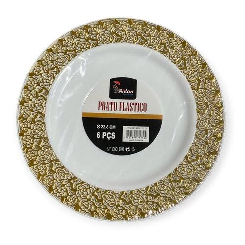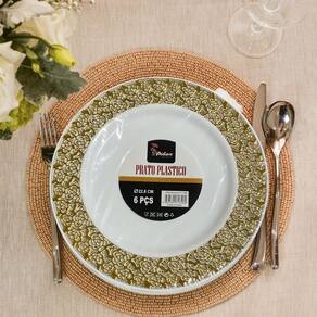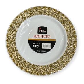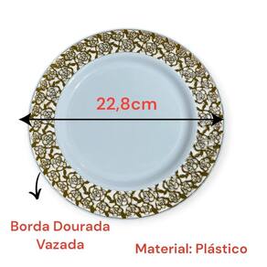 Kit 6 Pratos Redondo Reutilizável Borda Dourada Vazada 22Cm