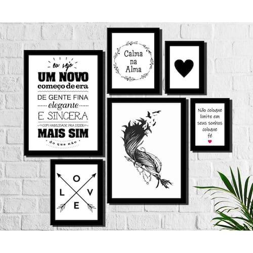 Kit 6 Quadros Decorativos Pena e Frases Preto e Branco 2 quadros 30x40 cm, 2 quadros 20x25 cm, 2 quadro 15x20 cm. Impressão digital em tecido canvas e montado em bastidor de madeira. Impressão nas laterais. Sobre o tecido canvas O tecido canvas é um material especial para impressão 100% algodão, com uma preparação especial resinada anti mofo. Apropriada para impressões de obras de artes e impressão de fotos tela, muito usadas em exposições em museus. A preparação do tecido encapsula o pigmento da tinta em uma camada protetora proporcionando resistência, o resultado é cores mais vivas e vibrantes sem perder a textura do tecido. É um material ecologicamente correto. Ean: 7908245601361