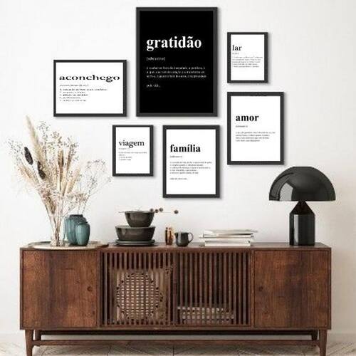 Kit Composição 6 Quadros Palavras Significado O Kit Composição 6 Quadros Palavras Significado é perfeito para quem busca decorar seu quarto, sala, cozinha, escritório, área gourmet e muito mais. Composto por 6 quadros, sendo 2 quadros com medida 18x24cm, 3 quadros com 24x33cm e 1 quadro com medida 33x45cm, esse kit oferece uma opção versátil de decoração. Os quadros são feitos com moldura de madeira preta, proporcionando um visual elegante e sofisticado. Além disso, o papel utilizado é de altíssima resolução, garantindo a qualidade da imagem. Para proteger a imagem, os quadros são acompanhados de uma película de acetato. A montagem dos quadros é simples e prática. Eles já vêm com penduradores, então você só precisa de um martelo e um prego para fixá-los na parede. Caso prefira, também é possível utilizar uma fita dupla face de alta qualidade. A limpeza dos quadros é fácil e rápida. Basta utilizar um pano seco ou um espanador para remover a poeira e manter os quadros sempre limpos. O Kit Composição 6 Quadros Palavras Significado possui de 3 meses, garantindo a sua satisfação com o produto. Com esse kit, você poderá deixar suas paredes mais bonitas e cheias de significado. Adquira agora mesmo o Kit Composição 6 Quadros Palavras Significado e transforme seus espaços com estilo e bom gosto. Marca: Não Informado