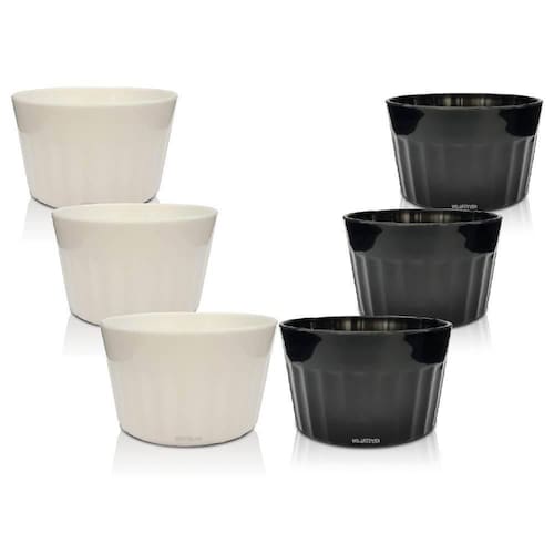 O ramequim é ideal para servir doces, sobremesas, molhos e muito mais, perfeito para decorar sua mesa com petiscos e porções de degustação, deixe sua mesa com mais elegância com os copos ramequim da krystalon. Características: material: plástico polipropileno não é ceramica, altura: 4,5 cm, diâmetro: 7,5 cm, capacidade: 90 ml, cor: branco/ preto, tamanho: ùnico, quantidade: 6 peças 3 ramequim branco e 3 ramequim preto Marca: Não Informado