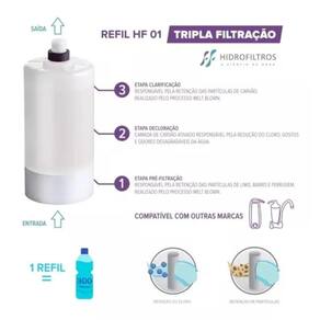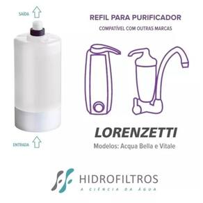 Kit 6 Refis Vela Filtro Água Lorenzetti Acqua Bella Vitale Kit 6 Refis Vela Filtro Água Lorenzetti Acqua Bella VitaleTome água da bica 100% pura e sem gosto ruim cuide de sua saúde e de sua família. Fácil é rápido para troca, não precisa de técncio, você mesmo troca. Basta seguir o manualEste refil responsável por reter partículas presentes na água, eliminar o excesso de cloro, gostos e odores desagradáveis da água e evitar a proliferação de bactérias. retire sujeiras e o cloro da água que você e sua família consomem.-3 etapas de filtragem, tenha água livre de sedimentos e do cloro em excesso.- A primeira camada de polipropileno atóxico retém a sujeira como areia, barro e limo.- Na sequência, a água encontra um leito de carvão ativado, com eficiência máxima em redução do cloro.- Por último, na etapa de clarificação, a água encontra uma nova barreira em polipropileno para evitar a passagem de sedimentos de carvão. O elemento filtrante HF01 possui ALTO PODER de remoção do cloro livre, sabores e odores indesejáveis, levando mais qualidade para a água consumida pelas pessoas. este elemento possui tripla filtração. A primeira camada de polipropileno atóxico retém a sujeira como areia, barro e limo. Na sequência, a água encontra um leito de carvão ativado, com eficiência máxima em redução do cloro. Por último, na etapa de clarificação, a água encontra uma nova barreira em polipropileno para evitar a passagem de sedimentos de carvão. características: esse refil é compatível com os seguintes produtos: - Acqua Bella - Purificador com Torneira- Acqua Bella - Purificador com Registro- Vitale Marca: Lorenzetti Hidrofiltros
