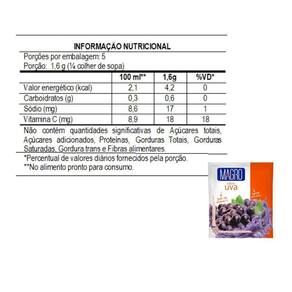 Kit 6 Refresco em Pó Sabor Uva Zero Açúcares 8g Sabor marcante e refrescância em cada gole O Refresco em Pó Sabor Uva Zero Açúcares 8g é a pedida ideal para quem deseja uma bebida leve, saborosa e prática. Com a intensidade característica da uva, ele combina frescor, baixo valor calórico e praticidade em uma opção perfeita para qualquer hora do dia. Com apenas 5 calorias por copo e zero adição de açúcares, é enriquecido com vitamina C, fornecendo 18% da ingestão diária recomendada. Uma forma simples de se hidratar com muito mais sabor e leveza. Diferenciais do Produto Zero açúcares Apenas 5 calorias por copo Fonte de vitamina C 18% IDR por porção Sabor marcante de uva Rende 1 litro por embalagem Sugestões de Consumo Prepare em 1 litro de água gelada para dias quentes Perfeito para acompanhar refeições leves Alternativa prática e deliciosa às bebidas açucaradas Ingredientes Maltodextrina, suco desidratado de uva, vitamina C ácido ascórbico , acidulante ácido cítrico, regulador de acidez fosfato tricálcico, edulcorantes artificiais ciclamato de sódio, aspartame e sacarina sódica , aromatizantes, estabilizante citrato trissódico, corantes artificiais. Alérgicos: pode conter soja. Contém fenilalanina. Não contém glúten. Fornece quantidades não significativas de açúcares. Modo de Preparo Dissolva o conteúdo do pacote 8g em 1 litro de água gelada Mexa bem até completa dissolução Armazenamento Conservar em local seco e fresco Após aberto, manter a embalagem fechada e consumir em até 10 dias Informações do Produto Produto: Refresco em Pó Sabor Uva Zero Açúcares Peso: 8g Validade: 18 meses após fabricação Rendimento: 1 litro Zero açúcares Fonte de vitamina C Apenas 5 kcal por copo Marca: Não Informado Ean: 7908688885465