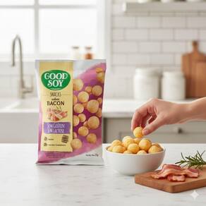 O Snack Sabor Bacon 25g - GoodSoy é uma opção saborosa e prática para quem procura um lanche diferente, com o irresistível gosto de bacon e a leveza de um snack assado. Feito com proteína de soja e sem glúten, combina sabor e textura crocante na medida certa.