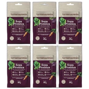 Kit 6 - perfeita para uma refeição ou lanche, prática e saborosa A sopa proteica é cremosa e com aquele temperinho que dá água na boca. - cará roxo, cenoura e espinafre o cará roxo é semelhante a batata e a batata doce - fonte de proteína 13g por porção - baixo teor calórico - carboidratos saudáveis - baixo índice glicêmico - fonte de fibras - feita com ingredientes naturais desidratados - sem adição de açúcar - vegana - rendimento: 8 porções - sem corantes artificiais, conservantes ou aromatizantes - rápida - fica pronta em 3 minutos - saborosa Descrição A sopa proteica é um alimento completo com alto teor de proteína vegetal, que possui como diferencial o uso de um tubérculo muito consumido na amazônia, o cará-roxo. A sopa é também uma opção para quem deseja fazer reposição de proteína, de forma prática, rápida e saborosa. O cará-roxo é rico em antocianinas e vitaminas, principalmente do complexo b. Também é rico em carboidratos complexos, de baixo índice glicêmico, além de fibras e pectina que ajudam na sensação de . A cenoura é rica em beta-caroteno, um poderoso antioxidante e . Tem efeito auxiliar na digestão, alto teor de fibras e de carboidratos complexos. O espinafre é rico em vitamina c, beta-caroteno, flavonóides e cálcio. Destaques Fonte de proteína 13g por porção Carboidratos saudáveis Sabor natural de cara-roxo Sugestão de consumo Adicione 40g 5 medidores em 300ml de água e leve ao fogo mexendo até a fervura. Continue por mais 3 minutos e sirva. Ingredientes Cará-roxo em pó, proteína isolada de ervilha, cenoura em pó, espinafre em pó, urucum em pó, pimenta do reino em pó, creme de cebola, tempero de ervas em pó, sal, goma xantana. Não contém glúten, não contém lactose.