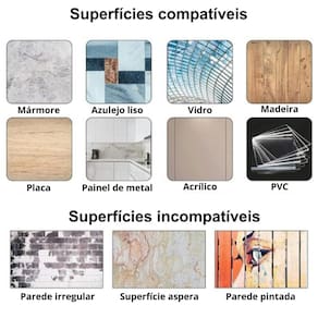 Superfícies Compatíveis: Para garantir uma fixação segura e durável, recomendamos instalar o suporte adesivo em superfícies lisas e impermeáveis, como: