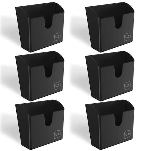 Garantia: 90 dias / Peso: 378g / Cor predominante: preto / Referência: UZ418PRX6 Dimensões de cada suporte: 10,5cm (C) x 14cm (L) x 8,9cm (A); Comporta (cada): até 50 guardanapos pequenos; Conteúdo: 6 suportes para guardanapos; Material: polipropileno (PP).