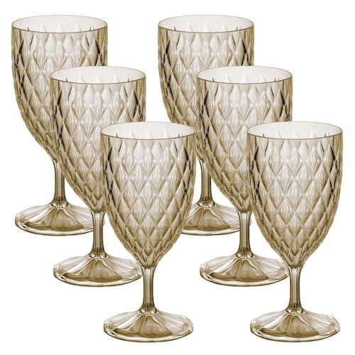 Kit com 6 taças de plástico para água com capacidade para 380ml cada (C:8,5 x L:8,5 x A:18,0 cm). São fabricadas em poliestireno (idêntico ao acrílico) e parecem vidro. Leves e resistentes, são ideais para uso na piscina. Podem ser levadas ao freezer (suportam temperaturas de -10º a 60º C). Todos os produtos são na cor âmbar e se combinam.Atenção:- Não pode ser levado ao micro-ondas;- Não pode ser lavado na lava-louças;- Sugerimos que a lavagem seja feita com o lado macio da esponja.Fabricante: Plasutil