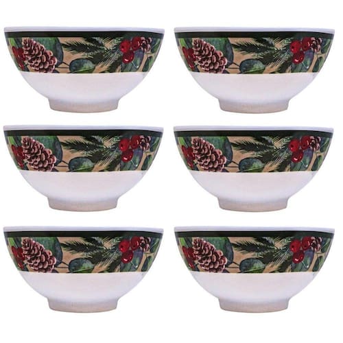 Não perca a oportunidade de adquirir o Conjunto de 6 Tigelas Bowl em Melamina com a estampa natalina de Pinhas e Folhagens. Elevará a experiência das suas refeições durante toda a temporada festiva.