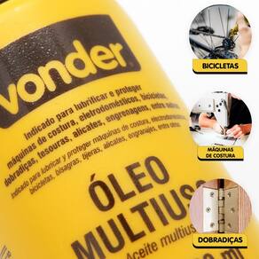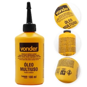 ESPECIFICAÇÕES TÉCNICAS: Marca: Vonder Referência: 5199040243 Tipo: Óleo multiuso Volume: 100 ml Peso aproximado por unidade: 0,11 kg Aspecto: Líquido amarelado Inflamável: Não Garantia de fábrica: 3 meses