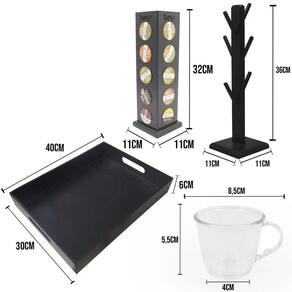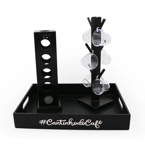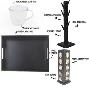 Kit 6 xicara acrílico porta capsulas para 3 corações bandeja cristal Composição do kit;6 xícaras1 bandeja1 suporte de xícaras1 porta capsulas para 3 corações Xícara 85ml acrílica transparente cristal As xícaras são muito bonitas e esse acrílico cristal traz um charme a mais ao produto, deixando-o mais decorativo para a hora do café. Você pode usar em casa ou no escritório, ter sempre à mão sua xícara para tomar aquele cafezinho, capuccino e até um chocolate quente se estiver com vontade. Capacidade 85mlMaterial - acrílicoAltura - 5,5 cmLargura - 8,5 cm Bandeja cantinho do café versátil e multiuso Feita em mdf de 6mm com pintura em tinta acrílica na cor preta ela é ideal para organizar o seu lar, servir um cafezinho para os amigos, organizar papeis de escritório entre diversas outras utilidades. Bandeja versátil de qualidade, combinando com todos os ambientes no qual estiver Suas medias são40x30x6 externa 38,5 x 28,5 x 5,5 na parte interna Possui as laterais vazadas como uma alça. Suporte porta xícara caneca em 6 pinos xicaras Esse é o produto ideal para decorar o seu tão especial cantinho do café ou até mesmo presentear uma pessoa querida, além da beleza o porta xicaras é feito em mdf que é muito resistente, ideal para xicaras/canecas de até 240ml. Com esse porta xicaras você vai conseguir deixar seus armários muito mais organizados. Medidas suporte:Altura: 36 cmBase: 11x11Peso: 282gMaterial de composição: madeira pinus Porta cápsula para cápsulas 3 corações Esse porta cápsulas tem ar moderno feito em madeira mdf pintada de preto, dando um ar de elegância para qualquer canto de sua casa. Organize seu cantinho do café com as cápsulas sempre a mão e ainda decore o seu ambiente com certeza vai ser uma peça que vai chamar a atenção e tirar elogios Feito em mdf com pintura preta tinta acrílica Comporta 20 capsulas 3 coraçõesMedidas 32x11x11 Cápsulas não inclusas Perguntas frequentes: - entregam para todo país Quem somos
