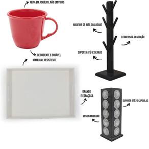 Kit 6 xicara porta capsulas para dolce gusto bandeja acrílico cores Cor xícaras: variada Composição do kit;6 xícaras1 bandeja1 suporte de xícaras1 porta capsulas para nespressoXícara 85ml acrílica As xícaras são muito bonitas e esse acrílico traz um charme a mais ao produto, deixando-o mais decorativo para a hora do café. Você pode usar em casa ou no escritório, ter sempre à mão sua xícara para tomar aquele cafezinho, capuccino e até um chocolate quente se estiver com vontade. Capacidade 85mlMaterial - acrílicoAltura - 5,5 cmLargura - 8,5 cm Bandeja cantinho do café versátil e multiuso Feita em mdf de 6mm com pintura em tinta acrílica na cor preta ela é ideal para organizar o seu lar, servir um cafezinho para os amigos, organizar papeis de escritório entre diversas outras utilidades. Bandeja versátil de qualidade, combinando com todos os ambientes no qual estiver Suas medias são40x30x6 externa 38,5 x 28,5 x 5,5 na parte interna Possui as laterais vazadas como uma alça. Suporte porta xícara caneca em 6 pinos xicaras Esse é o produto ideal para decorar o seu tão especial cantinho do café ou até mesmo presentear uma pessoa querida, além da beleza o porta xicaras é feito em mdf que é muito resistente, ideal para xicaras/canecas de até 240ml. Com esse porta xicaras você vai conseguir deixar seus armários muito mais organizados. Medidas suporte:Altura: 36 cmBase: 11x11Peso: 282gMaterial de composição: madeira pinus Porta cápsula vazado a laser nespresso. O nosso porta cápsulas, guarda com segurança e deixa organizado prendendo bem a cápsula sem deixar cair produto bem desenvolvido com muito charme e tons modernos para deixar o ambiente mais bonito Esse porta cápsulas tem ar moderno que mescla os tons e veio da madeira de pinus com o local em preto aonde é encaixado as cápsulas sendo assim um da destaque ao outro organize seu canto do café com as cápsulas sempre a mão e ainda decore o seu ambiente com certeza vai ser uma peça que vai chamar a atenção e tirar elogios Feito em pinus de reflorestamento natural e de mdf com pintura em preto tinta acrílica Comporta 28 capsulas nespressoMedidas 32x10x10 O pinus é natural, não leva verniz e nem seladora. Por se tratar de madeira natural deve haver variações na tonalidade e apresentar veios da madeira em locais distintos. - entregam para todo país Quem somos