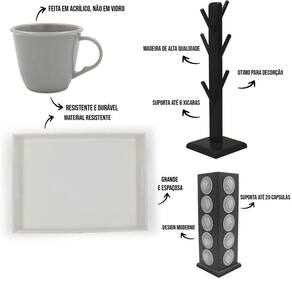 Kit 6 xicara porta capsulas para dolce gusto bandeja acrílico cores Cor xícaras: cinza Composição do kit; 6 xícaras 1 bandeja 1 suporte de xícaras 1 porta capsulas para nespresso Xícara 85ml acrílica