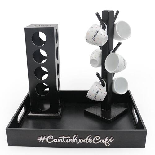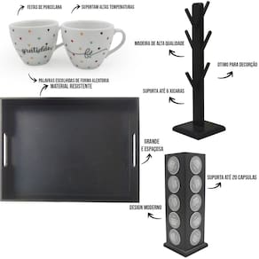Kit 6 xicaras coquinho porta capsulas para dolce gusto bandeja Composição do kit; 6 xícaras 1 bandeja 1 suporte de xícaras 1 porta capsulas para dolce gusto Xícara 80ml ceramica Palavras + corações As xícaras são muito bonitas e esses corações coloridos dão um charme a mais no produto, deixando ele mais decorativo para a hora do café. Você pode usar em casa ou no escritorio, ter sempre à mão sua caneca para tomar aquele cafezinho, capuccino, suco, agua e até uma cervejinha se estiver com vontade. Capacidade 80ml Material - ceramica Altura - 6 cm Largura - 8,5 cm Atenção: Frases das xícaras são enviadas aleatoriamente e na quantidade do kit As frases disponíveis enviadas são; gratidão, fé, paz, amor, felicidade, família, love, te adoro, proteção, prosperidade, saúde, amizade, seja luz, sucesso, te amo. Bandeja cantinho do café versátil e multiuso Feita em mdf de 6mm com pintura em tinta acrílica na cor preta ela é ideal para organizar o seu lar, servir um cafezinho para os amigos, organizar papeis de escritório entre diversas outras utilidades. Bandeja versátil de qualidade, combinando com todos os ambientes no qual estiver Suas medias são 40x30x6 externa 38,5 x 28,5 x 5,5 na parte interna Possui as laterais vazadas como uma alça. Suporte porta xícara caneca em mdf 6 pinos xicaras Esse é o produto ideal para decorar o seu tão especial cantinho do café ou até mesmo presentear uma pessoa querida, além da beleza o porta xicaras é feito em mdf que é muito resistente, ideal até 6 xicaras/canecas de 240ml. Com esse porta xicaras você vai conseguir deixar seus armarios muito mais organizados. Medidas suporte: Altura: 36 cm Base: 11x11 Peso: 282g Material de composição: mdf Porta cápsula para cápsulas 3 corações Esse porta cápsulas tem ar moderno feito em madeira mdf pintada de preto, dando um ar de elegância para qualquer canto de sua casa. Organize seu cantinho do café com as cápsulas sempre a mão e ainda decore o seu ambiente com certeza vai ser uma peça que vai chamar a atenção e tirar elogios Feito em mdf com pintura preta tinta acrílica Comporta 20 capsulas 3 corações Medidas 32x11x11 Cápsulas não inclusas Perguntas frequentes: - entregam para todo país - emite resp: sim, todos os nossos produtos tem e emissão de Quem somos Somos uma loja virtual em busca de satisfazer ao máximo o cliente trabalhando dentro das maiores lojas online do brasil com grande variedade de produtos e de ótima qualidade.