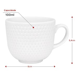 - Capacidade: 100ml - Kit com 6 xícaras e 6 Pires - Xícaras Produzidas em Porcelana - Pires Produzidos em Bambu - Medidas Xícara: 5,5cm x 6cm Altura x Diâmetro - Medidas Pires: 9,5cm x 0,8cm Diâmetro x Altura Ean: 7908281372126