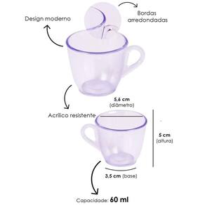 Kit com 6 canecas / xicara de café/chá em acrílico cristal com designer clássico e elegante décor. Lindas canecas acrílica cristal para tomar aquele cafezinho ou chá com sabor de velha infância, estilo retrô - vintage. Confeccionadas em acrílico cristal alto brilho e de alta qualidade com acabamento perfeito, além de ser uma ótima opção para presentear. A hora do café é sempre um momento especial. Então o que acha de incrementar a sua mesa de café da manhã ou da tarde, dando um toque moderno e estiloso com essas lindas xicaras de café acrílico cristal 60ml Dimensões: - canecas / xícara em acrílico cristal: altura: 5 cm x largura: 5 cm. Capacidade: 60 ml Características do produto: - caneca / xícara em acrílico cristal de alta qualidade e durabilidade; - produzido por artesões profissionais seguindo um padrão de qualidade que atenda o gosto dos nossos clientes Cuidados: - recomendamos o uso de pano levemente umedecido para sua limpeza. Garantia do produto: - o produto é muito bem acomodado dentro da caixa, e super embalado para evitar quebras, ainda assim possuímos um sistema de garantia e troca. Imagens meramente ilustrativas - produto artesanal, podendo variar de cor e/ou tonalidade Marca: Retrofenna Decor Ean: 7892340152685