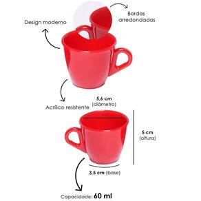 Kit 6 xicaras em acrílico cristal de café - chá decor - vermelha Kit 6 xicaras de café / chá em acrílico cristal décor Kit com 6 canecas / xicara de café/chá em acrílico cristal com designer clássico e elegante décor. Lindas canecas acrílica cristal para tomar aquele cafezinho ou chá com sabor de velha infância, estilo retrô - vintage. Confeccionadas em acrílico cristal alto brilho e de alta qualidade com acabamento perfeito, além de ser uma ótima opção para presentear. A hora do café é sempre um momento especial. Então o que acha de incrementar a sua mesa de café da manhã ou da tarde, dando um toque moderno e estiloso com essas lindas xicaras de café acrílico cristal 60mlDimensões:- canecas / xícara em acrílico cristal: altura: 5 cm x largura: 5 cm.Capacidade: 60 mlCaracterísticas do produto:- caneca / xícara em acrílico cristal de alta qualidade e durabilidade;- produzido por artesões profissionais seguindo um padrão de qualidade que atenda o gosto dos nossos clientesCuidados:- recomendamos o uso de pano levemente umedecido para sua limpeza.Garantia do produto:- o produto é muito bem acomodado dentro da caixa, e super embalado para evitar quebras, ainda assim possuímos um sistema de garantia e troca.Imagens meramente ilustrativas - produto artesanal, podendo variar de cor e/ou tonalidade Marca: Retrofenna Decor