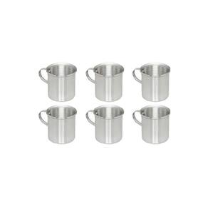 Kit composto por 6 unidades de canecas de aluminio com alça também em alumínio, confeccionada com material reforçado, sendo cada caneca com capacidade de 300ml. com boca de 8cm de diâmetro. Ideal para linha de utilidade doméstica, bem como escolas, creches e etc.