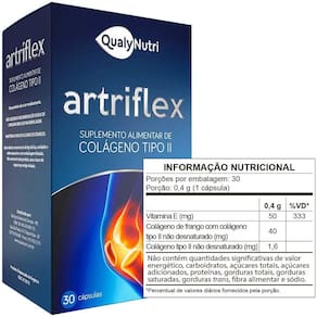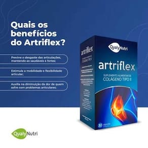 Kit 6X Artriflex Colágeno Tipo 2 40Mg Com 30 Cada Qualy Nutri O que é o Artriflex 40mg 60 Cápsulas, Qualy Nutri O Artriflex 40mg 60 Cápsulas da Qualy Nutri é um suplemento alimentar indicado para a prevenção e fortalecimento das articulações. Sua fórmula exclusiva contém Colágeno Tipo II, que ajuda a manter as articulações saudáveis, além de promover maior mobilidade e flexibilidade. É ideal para quem busca cuidar da saúde articular e garantir mais qualidade de vida, especialmente para quem pratica atividades físicas ou sente rigidez nas articulações. O Artriflex 40mg contém os seguintes ingredientes principais: Colágeno Tipo II: Essencial para a manutenção da saúde das articulações e cartilagens, contribuindo para a flexibilidade e mobilidade; Óleo de Girassol: Um veículo que facilita a absorção dos nutrientes e auxilia na saúde geral das articulações; Cápsula: Gelatina, Água Purificada, Umectante INS422 e Corante Dióxido de Titânio, Amarelo 10 . Este produto é livre de glúten, tornando-se adequado para pessoas com restrições alimentares. Para que serve o Artriflex 40mg 60 Cápsulas O Artriflex 40mg 60 Cápsulas é indicado para fortalecer as articulações e prevenir problemas articulares, especialmente para quem busca manter a mobilidade e flexibilidade das articulações. É uma excelente opção para quem sente desconforto nas articulações ou deseja melhorar a saúde articular como parte de uma rotina de cuidados preventivos. Benefícios do Artriflex 40mg: - Fortalecimento das articulações, prevenindo o desgaste da cartilagem; - Melhora da mobilidade e flexibilidade das articulações; - Auxílio no alívio da rigidez articular; - Ideal para adultos que buscam melhorar a saúde das articulações, especialmente para quem pratica atividades físicas; - Produto livre de glúten, adequado para diversas dietas e restrições alimentares. Como devo usar o Artriflex 40mg 60 Cápsulas Recomenda-se a ingestão de 1 cápsula ao dia, para adultos acima de 19 anos. É importante não exceder a recomendação diária de consumo indicada na embalagem. Advertências: Este produto não é um ; Conservar em local fresco, seco e ao abrigo da luz e umidade excessiva; Mantenha fora do alcance de crianças; Não exceder a recomendação diária de consumo indicada na embalagem. Marca: Não Informado Ean: 7891539322700