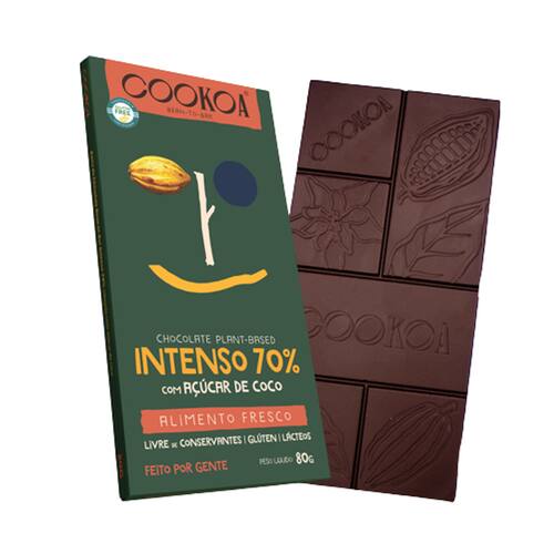 Para criar uma experiência única, o Chocolate Intenso 70% Cacau Vegano Cookoa é composto por um blend exclusivo de amêndoas do cacau forasteiro da Bahia, ao sabor frutado e marcante do cacau selvagem amazônico e a suavidade exótica do cacau criollo peruano.