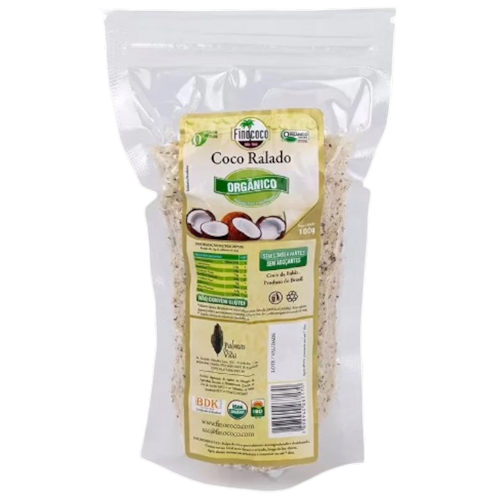 O Coco Ralado Orgânico Finococo é um produto 100% natural e integral, sem adição de açúcares, conservantes, aromatizantes ou outros produtos químicos normalmente encontrados nos produtos convencionais do mercado. Fechado à vácuo, mantem inalteradas suas propriedades por até 6 meses após o envase.