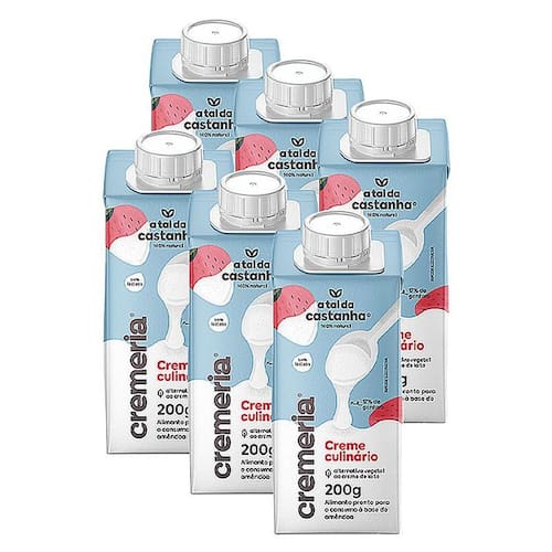 Kit 6x: creme culinário vegetal cremeria a tal da castanha 200ml O creme culinário vegetal cremeria a tal da castanha é uma alternativa vegetal ao creme de leite. É 100% natural, sem lactose e à base de amêndoa.