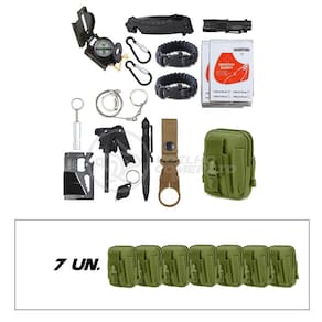 - Materiais: Tecido/Pano (Bolsa), Aço (Faca, cartão multifuncional, caneta e etc.), Plástico (Lanterna), Alumínio (Manta Térmica).
