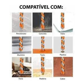 Kit 7 Brocas Fura Tudo Diamantadas Multifuncional Completa Kit com 7 Brocas que multifuncional - Alta Performance Inclui os tamanhos: 12 mm, 10 mm, 8 mm, 6 mm, 5 mm e 4 mm e 3mm... Peças de qualidade aprovada, muito útil e prática para o dia a dia do profissional. =====NÃO FURA PORCELANATO===== Aplicações das brocas- Concreto, usar com impacto e com água;- Parede de tijolos, usar com impacto e com água;- Azulejo, usar sem impacto, com água em baixo RPM;- Pisos cerâmicos, usar sem impacto, com água e baixo RPM;- Tijolo, usar com impacto e com água,- Madeira, usar sem impacto, sem água seco e em baixo RPM;- Aglomerado de Madeira, usar sem impacto, sem água seco e em baixo RPM;- Plástico, usar sem impacto, sem água seco e em baixo RPM;- Aglomerado de plástico, usar sem impacto, sem água seco e em baixo RPM;- Ardósia, usar sem impacto, com água e em baixo RPM;- Calcário, usar sem impacto, com água e em baixo RPM;- Chapas finas de metal; usar sem impacto, com fluido de refrigeração e em baixo RPM;- Vidro; usar sem impacto, com água e em baixo RPM; NÃO fura vidro temperado